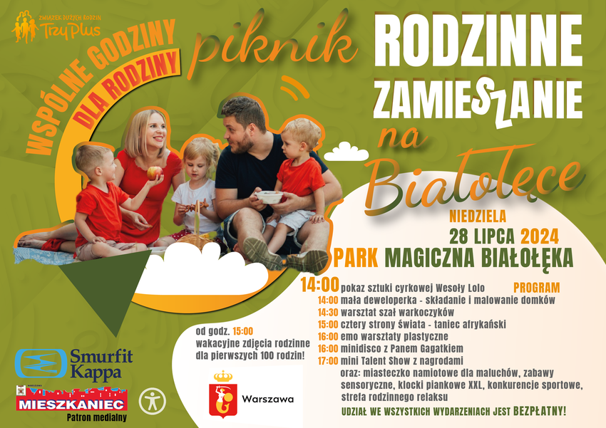 Związek Dużych Rodzin Trzy Plus zaprasza warszawskie rodziny do udziału w nowym projekcie „Wspólne godziny dla rodziny”, który jest współfinansowany przez Miasto Stołeczne Warszawa. Projekt ten ma na celu organizowanie różnorodnych wydarzeń dla rodzin w przestrzeni publicznej, aby promować spędzanie czasu razem, budowanie relacji i zdrowy, aktywny styl życia. W ramach projektu zaplanowanych jest łącznie 57 wydarzeń w Warszawie.