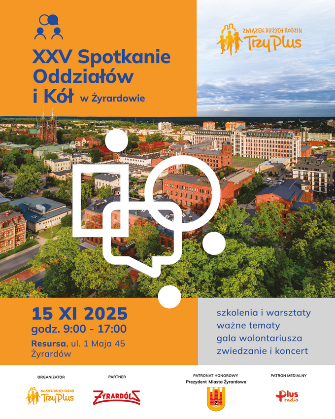 Serdecznie zapraszamy na XXV Ogólnopolskie Spotkanie Oddziałów i Kół Związku Dużych Rodzin 3+, które odbędzie się już 15 listopada 2025 roku w Żyrardowie